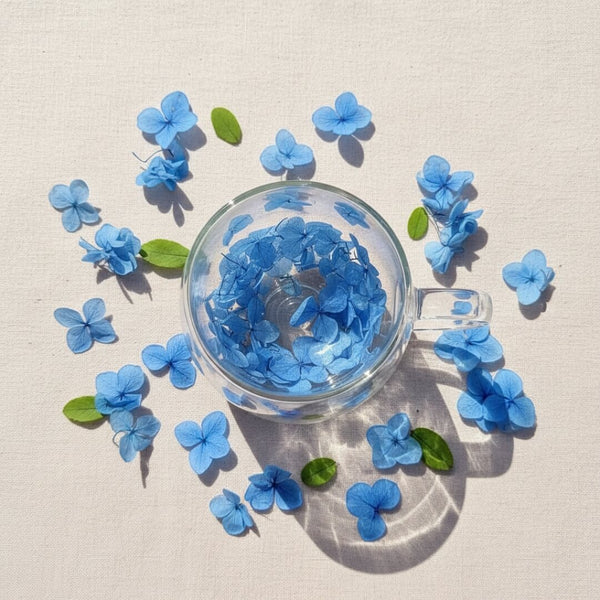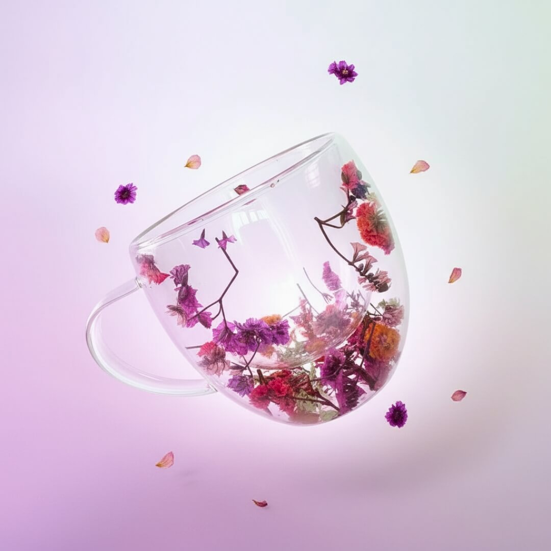 Сушените цветя, вплетени в стъклото, превръщат всяка глътка в естетично изживяване.